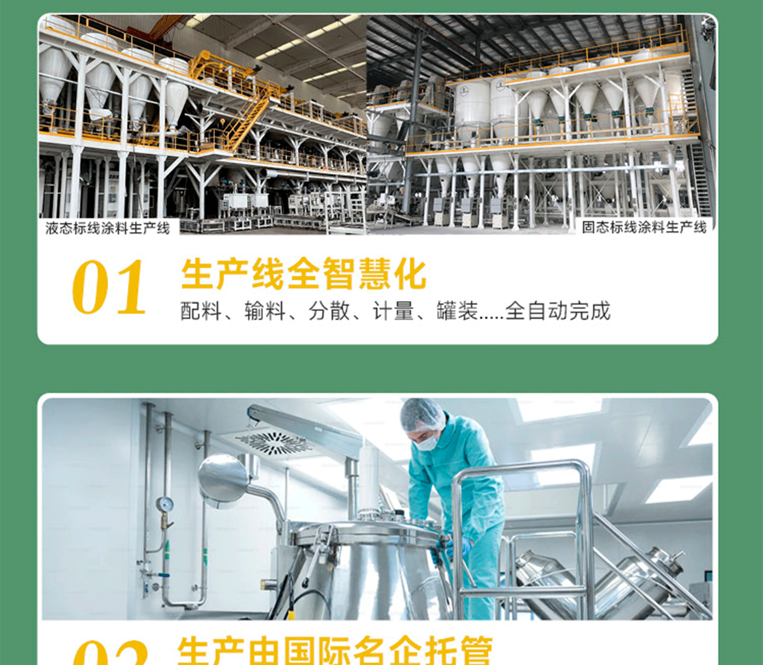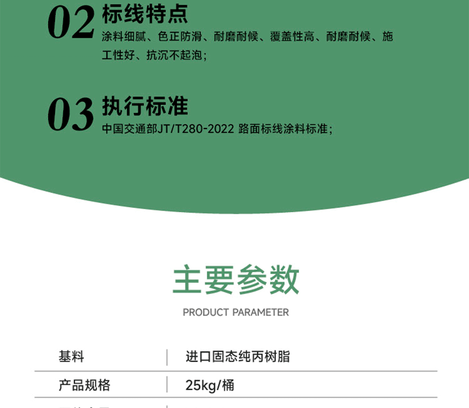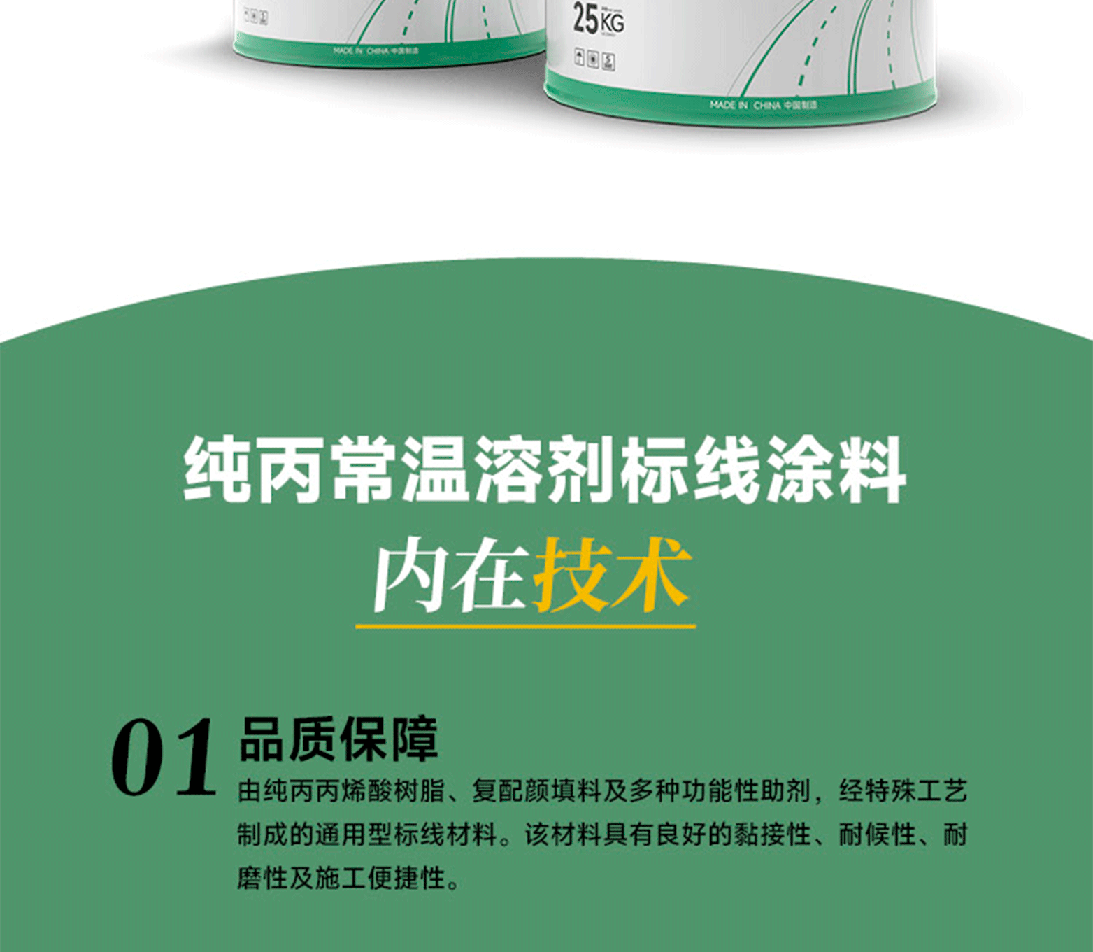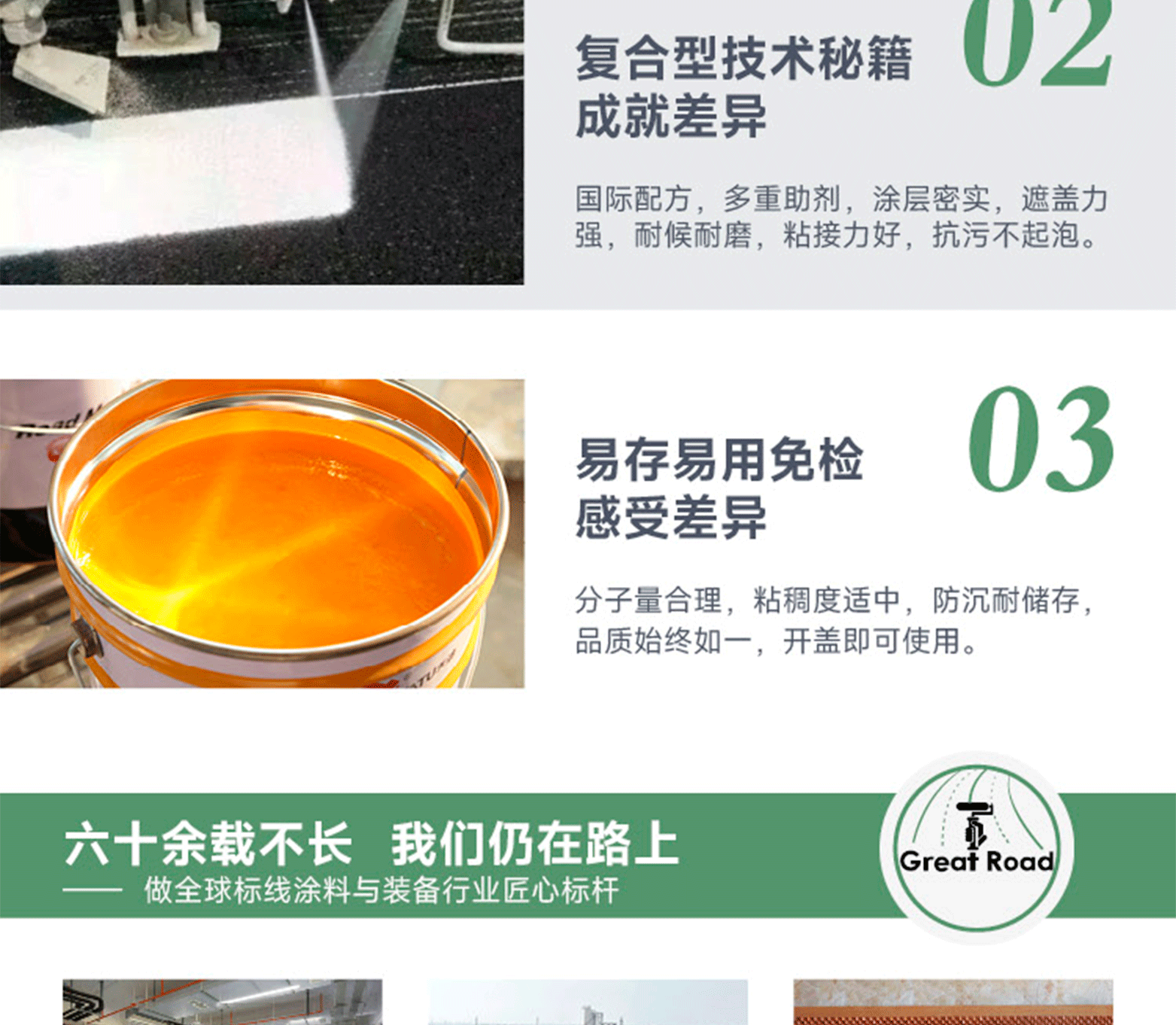 由純丙丙烯酸樹脂、復配顏填料及多種功能性助劑,經特殊工藝制成的通用型標線材料。標線特點:涂料細膩、色正防滑、耐磨耐候、覆蓋性高、耐磨耐候、施工性好、抗沉不起泡;