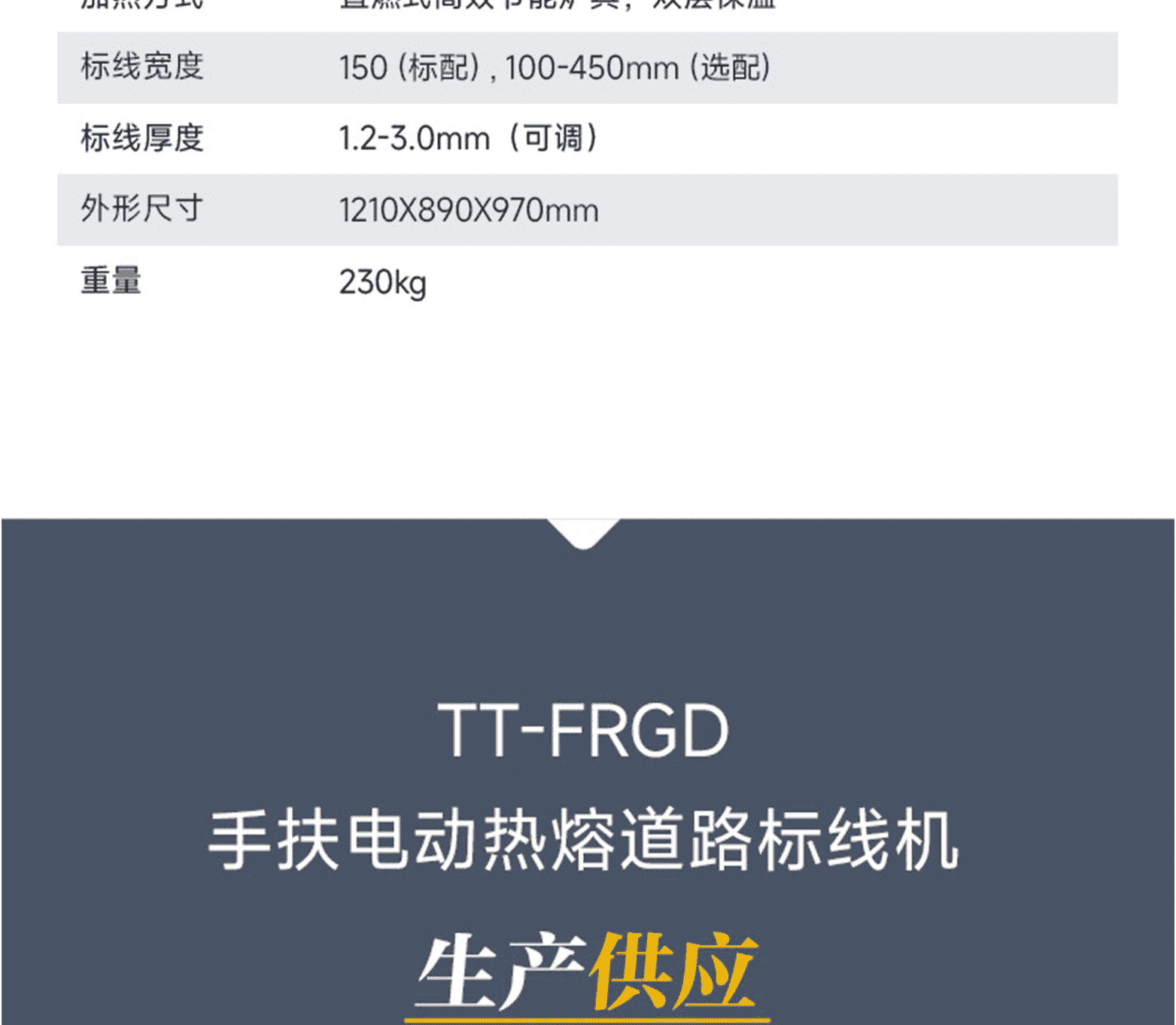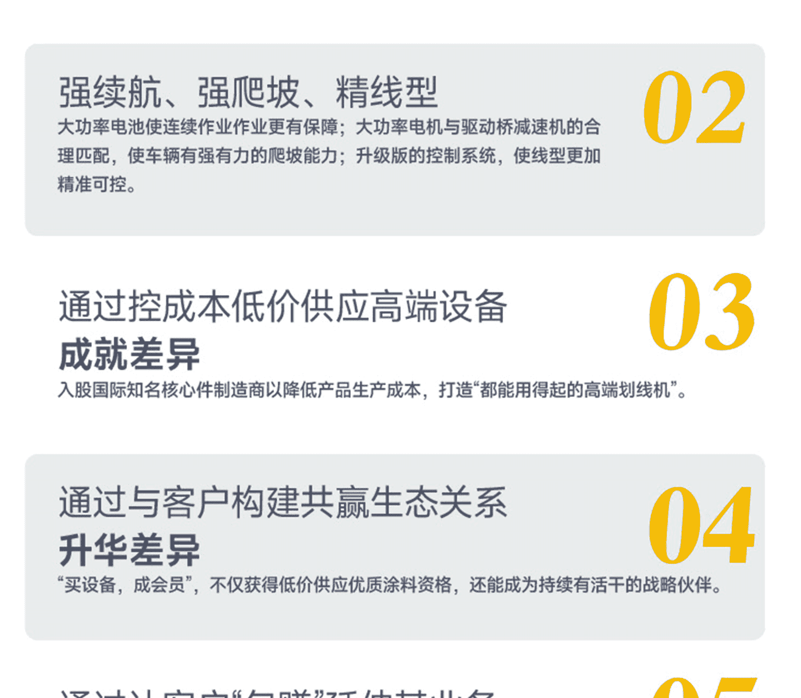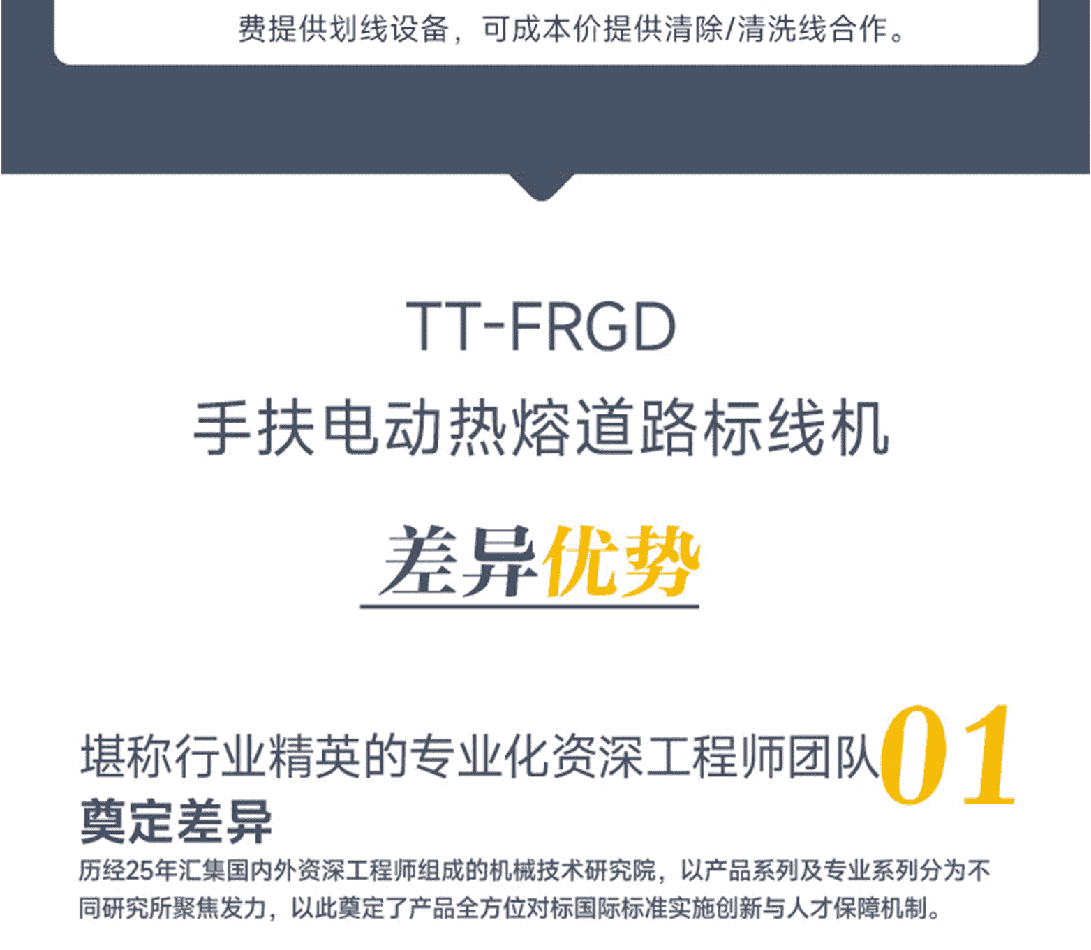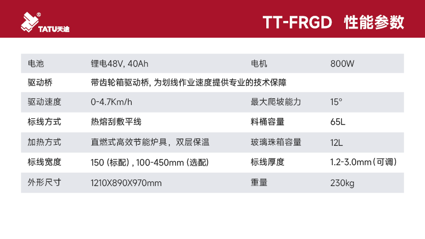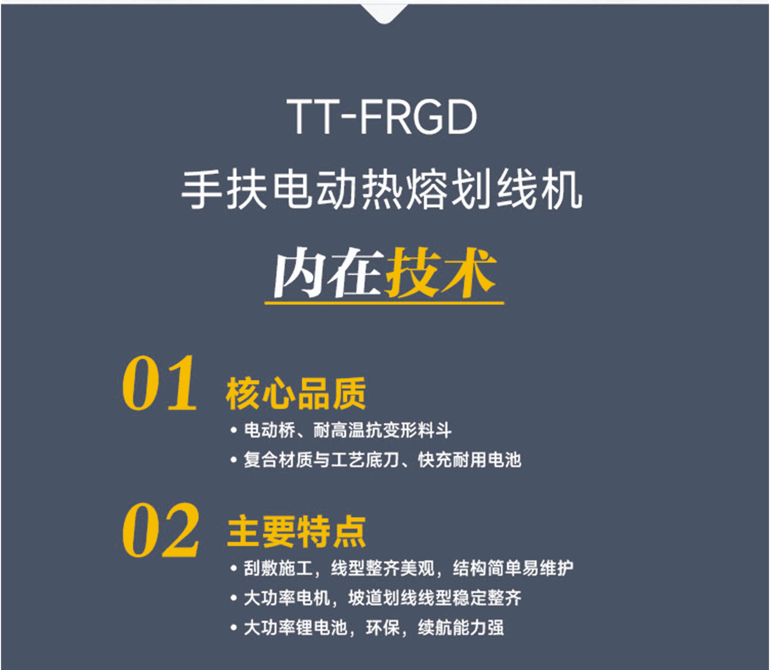 主要特點:刮敷施工,線型整齊美觀,結構簡單易維護。大功率電機,坡道劃線線型穩定整齊。大功率鋰電池,環保,續航能力強