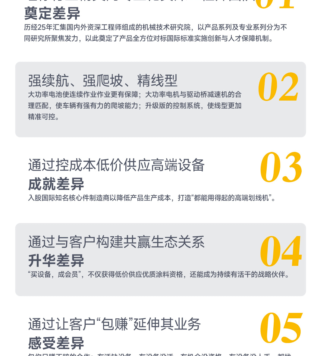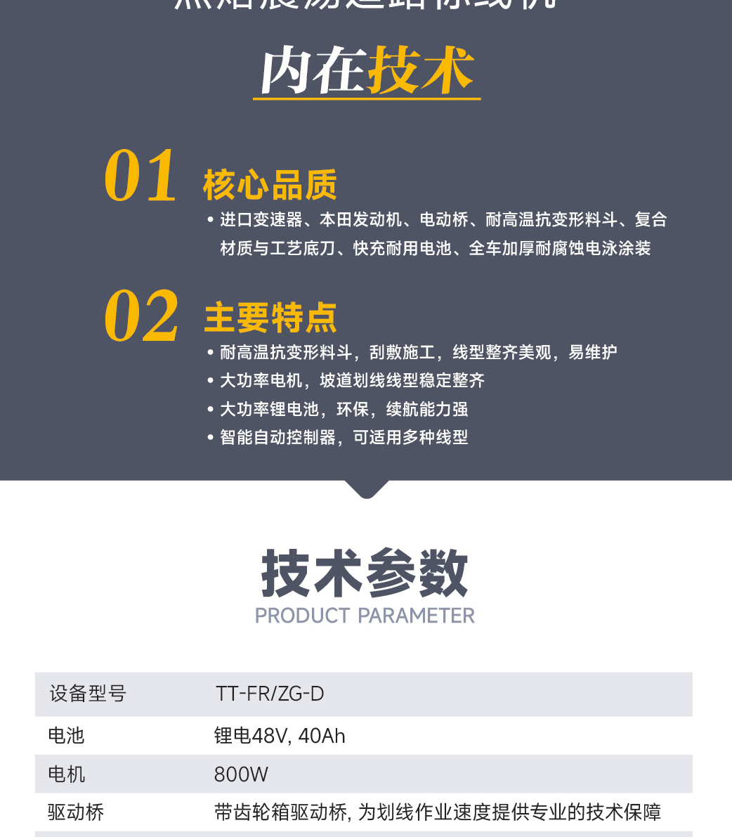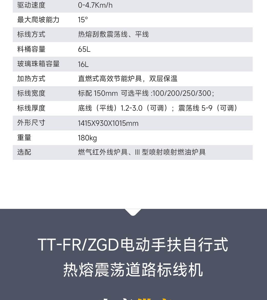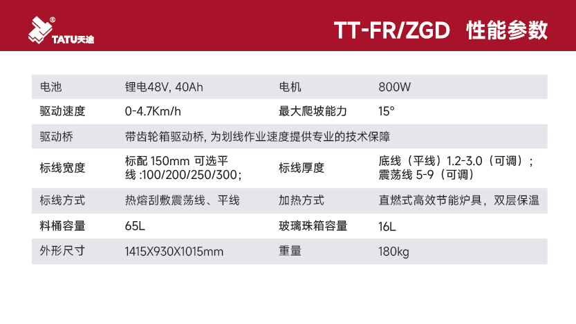 主要特點:耐高溫抗變形料斗,刮敷施工,線型整齊美觀,易維護。大功率電機,坡道劃線線型穩(wěn)定整齊。大功率鋰電池,環(huán)保,續(xù)航能力強。智能自動控制器,可適用多種線型